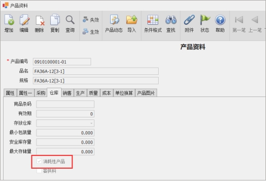 在使用消耗性物料时,需要设置物料为消耗性物料。可以进入 产品资料 中找到消耗性产品,勾选则代表使用消耗性产品领料方式 ,勾选消耗性产品