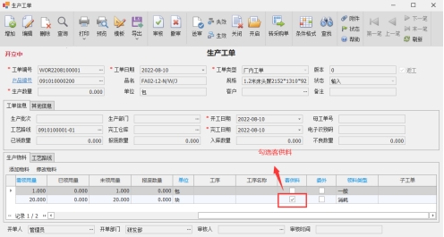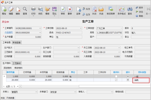 勾选消耗性产品后,在开立工单时,会将领料类型标记成消耗,也可以手动修改工单的领料属性,工单设定好后即可正常发料。