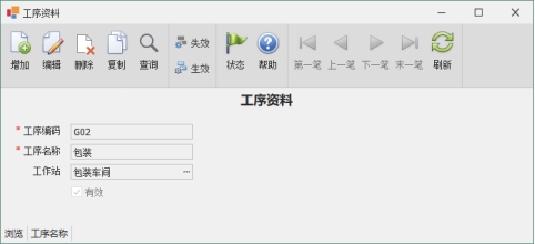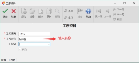 进入【生产管理】-【工艺线路】-【工序资料】找到工序资料维护界面(如下图),新增时指定工序名称以及工序编码即可,工作站非必须
