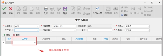 1)生产入库录入生产入库单,点击“增加”进入新增模式后,进入单身选择工单编号,如果工单可以入库将自动带出品名和规格,如果无法入库将弹出无法入库的提示