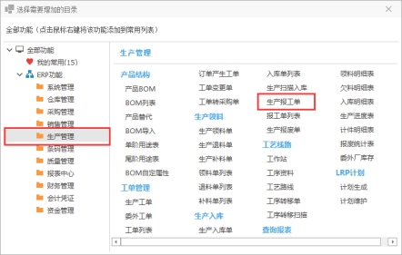 如果启用工艺管理,可以使用 工序转移单 进行报工