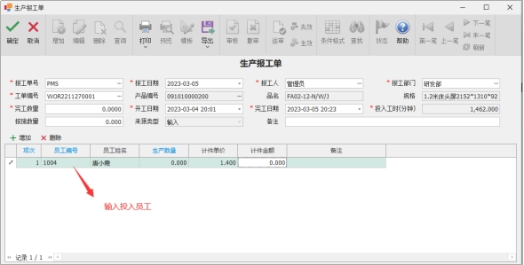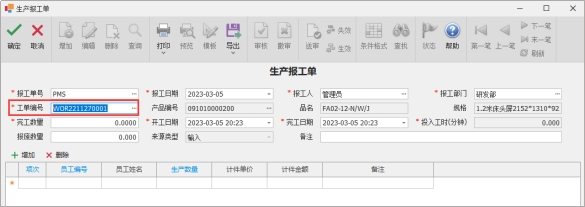 3)输入本工单投入的生产人员信息,如果启用计件管理则可输入计件单价和生产数量,多个员工生产可以累计,例如多个员工共同生产时