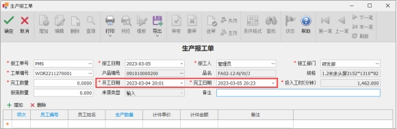 2)输入开工如期和完工日期,输入完成后将自动合计投入工时(分钟)