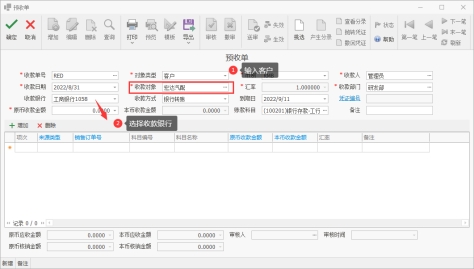 当客户支付订金后,需要进行预收款作业。首先输入应收对象(客户)后将自动带出其他信息。