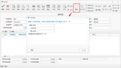 2)挑选需要预收款的销售订单,如果没有限定条件可直接点击下一步,如果知道预收的销售订单则可在此输入销售订单号