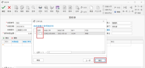 3)选择需要预收的销售订单项目,点击确定即将选择的订单产生到单身中