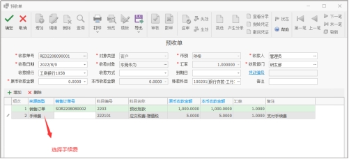 如果预收款时产生了手续费可在预收单身添加手续费金额,手续费将自动归属到手续费科目中