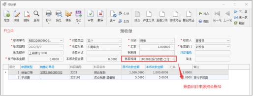 预收单账款科目(如下图)需要输入一个科目才可以产生分录底稿,如果有设定账套默认科目,将会自动带出。预收单的账款科目来来自于资金账号资料的默认科目。