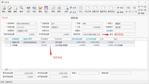预收单单头的账款科目一般为贷方科目,单身的科目为借方科目。 在产生分录底稿时将按照此设定产生