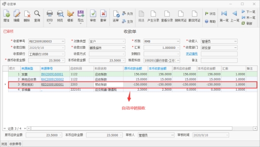 已经收取了客户的预收款后,等到送货给客户后收到客户货款付款时,需要对预收款单进行核销,核销方法是进入收款单进行核销,预收单项目将显示为负数,以用来对冲销售发票。