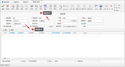 1)首先先输入对象类型(选择客户)再输入应收客户后将自动带出其他信息。单身将显示可以退款的预付单。