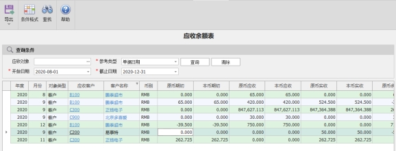 在“查询条件”区域输入需要查询的条件,并输入开始日期和截止日期,例如以下截图查询2020年8月份到12月份的所有应收余额,其中“参考类型”默认选择为单据日期
