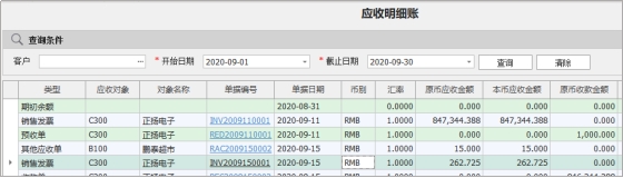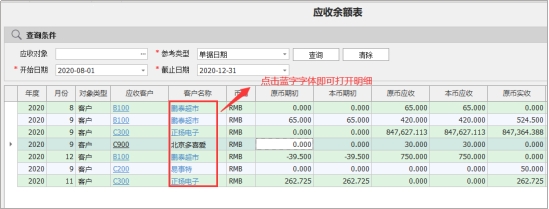 在余额表中需要查看余额的明细时,可以在此报表中直接跳转到明细表中,只需点击“客户名称”列的蓝色字体栏位即可打开明细表(如下图)