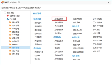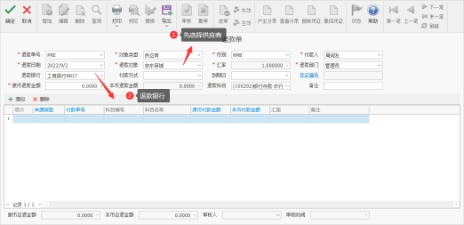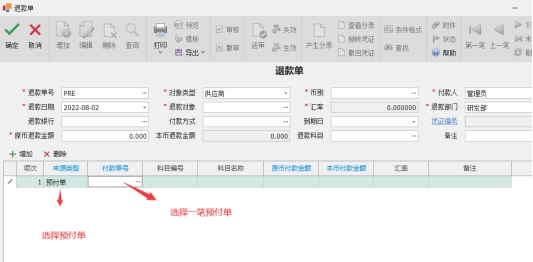 应付退款单是预付单付款后,付款对象又退回时使用,例如已支付供应商订金后又退回,如果预付单已核销则不再允许做退款单。