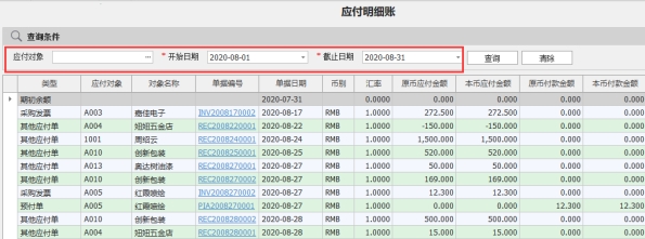 在如下图在查询条件区域内输入查询条件,例如:输入供应商,开始日期和截止日期,点击查询即可查询出数据,例如下图查询8月份的明细账。