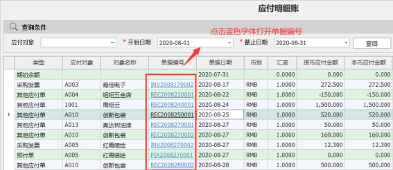 在应付明细账中可以快速串查到来源单据,操作方法是点击“单据编号”列的蓝色字体