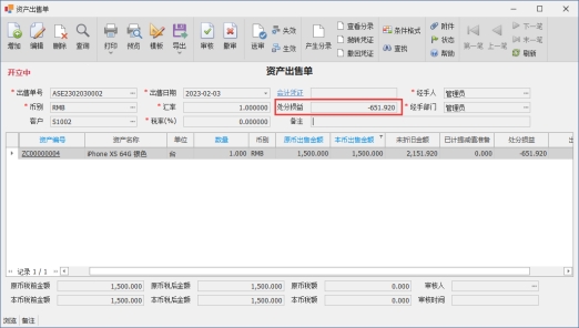 资产出售时如果出售金额和未折旧金额有差异,则会产生处分损益,如果处分损益为负数杂代表本次出售有亏损,如果为正数则代表本次出售有收益。