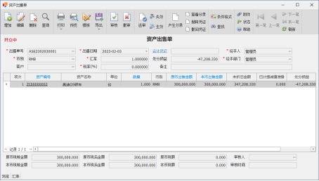 资产出售单新增完成后需要审核以生效,审核单据后,该资产的成本金额将扣除掉本次出售的金额,如果固定资产出售后数量为0 则状态将变成“出售”。此时资产将从清册中销账并不再参与折旧。