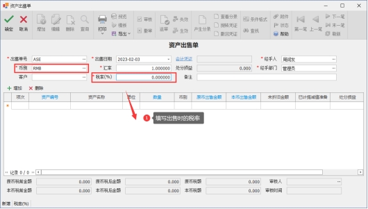 1)点击“增加”进入资产出售单新增,输入资产出售的必要信息(如下图),其中币别和税率需要必须输入,如果出售是外币,则需要指定出售时外币的汇率。如果出售时存在税收,则可在此指定实际税率。