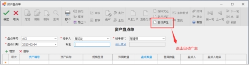 1)点击“增加”进入资产盘点新增,输入必要信息(如下图),可点击“自动产生”将所有可盘点符合条件的资产自动产生盘点数据。