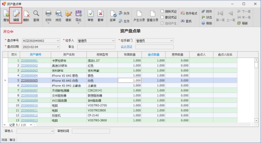 1)当盘点清册进行实地盘点后,需要将清点数据录入盘点单以便产生盘点差异,在查询出指定盘点单后,点击“编辑”按钮进入编辑模式(如下图)。
