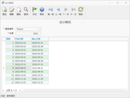 会计期间用于设定每期的开始日期和截止日期,作为会计凭证和账簿报表的期间依据,在中国地区,一般会计期间按照自然月(每年12期)设定,也可以按照实际需求设计每期的开始日期和截止日期,本功能也将按照自然月自动产生。应在每年年末产生下一年的会计期间。