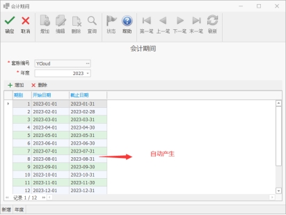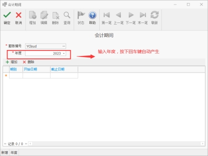 1)新增会计期间时只要输入年度,即可默认自动带出12期资料,输入年度后按下回车键