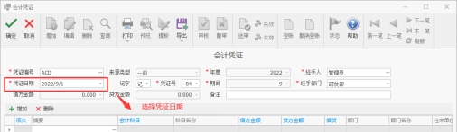 1)点击增加按钮,选择凭证日期,确定所属年度和期间。