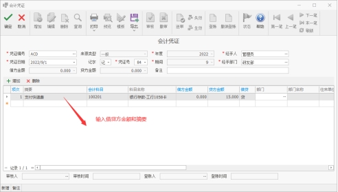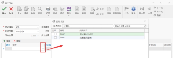 2)输入借贷方金额和摘要,在摘要栏可以点击开窗选择常用的摘要