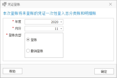2)选择年度和月份,已经登账类型是登账还是撤销登账,点击确定即可将本月度未登账的凭证进行登账,选择月份不可小于总账关账日