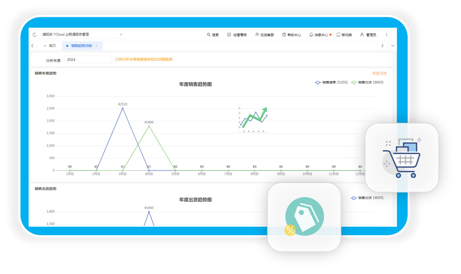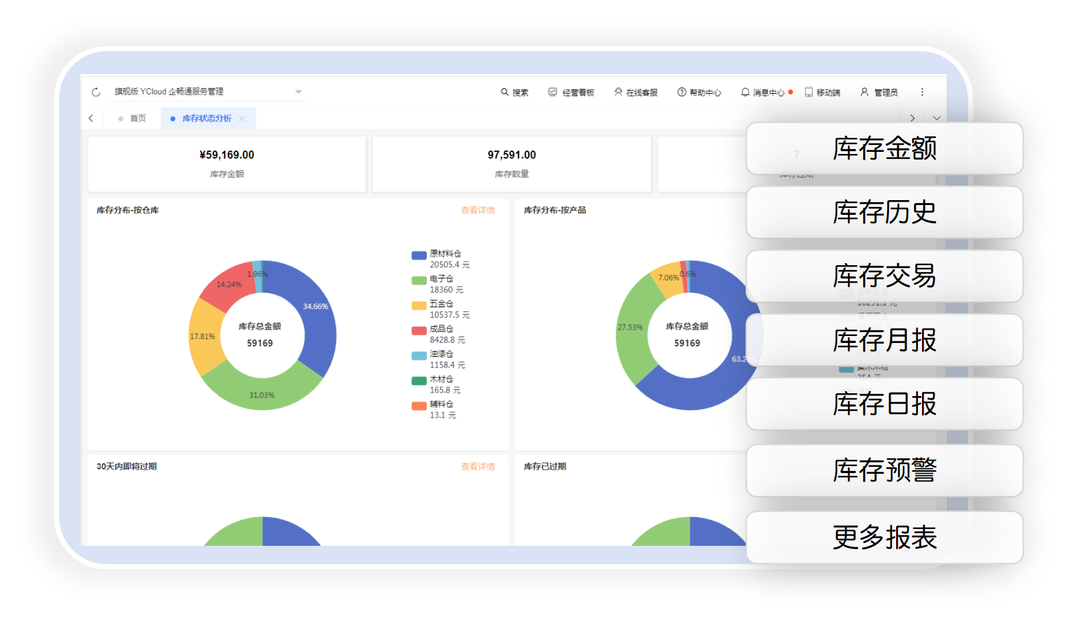 通过可视化看板,多维度分析经营状态,例如分析仓库库存分布,销售额,货款分布,销售趋势,销售对比,生产进度等场景