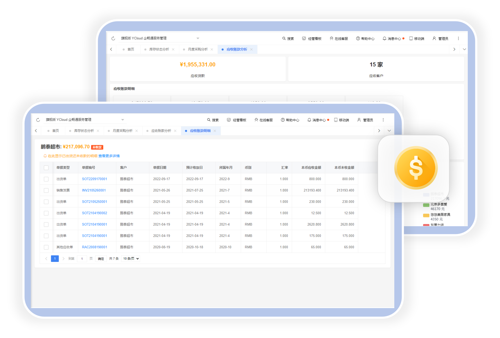 管理客户应收账款。应收账款账期,销售发票,收款冲账等。丰富的应收账款数据分析,时刻掌控账款状态