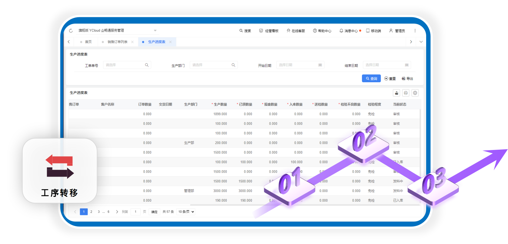 精细化生产工艺过程管控,支持流程转移报工等复杂生产场景