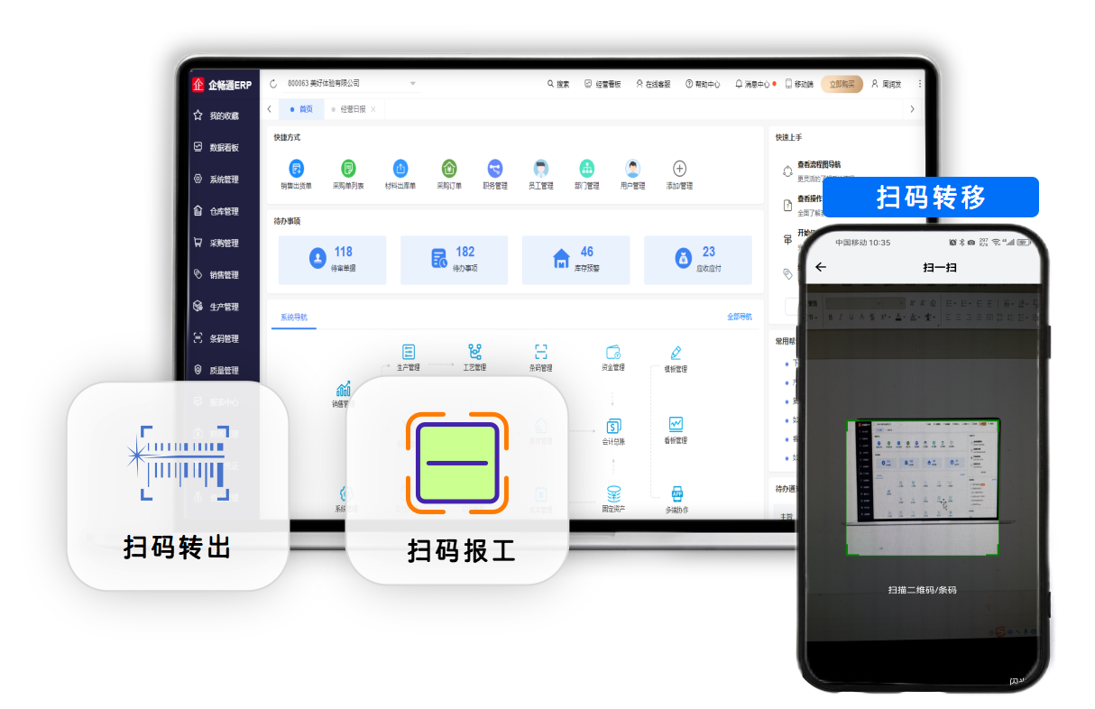 支持生产车间条码管理,扫码领料,扫码入库,扫码工序转移,扫码汇报。支持条码枪和APP